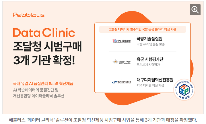 페블러스의 AI 데이터 품질관리 솔루션 '데이터 클리닉'이 조달청 혁신제품 시범구매 사업을 통해 국방기술품질원, 육군 시험평가단, 재단법인 대구디지털혁신진흥원 등 3개 기관과 매칭이 확정되었다. 이번 성과는 페블러스의 기술력이 민간 고객을 넘어 국방 및 공공 조달 분야에서 공식적으로 인정받은 사례로 평가되며, 이를 통해 공공 AI 데이터 품질의 새로운 표준을 제시할 것으로 기대된다.