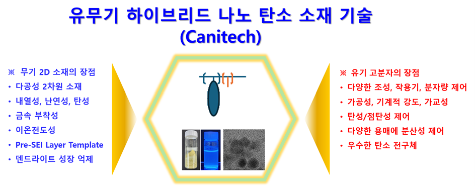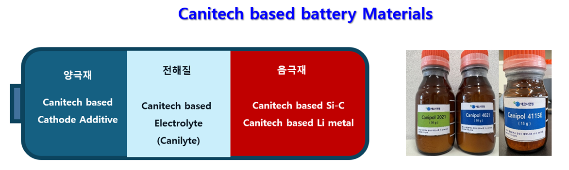 ▶ Canitech 소재는 무기 2D 소재와 유기 고분자의 장점을 함께 갖는 하이브리드 소재로 고용량 장수명이 가능하며 확장성이 우수함
