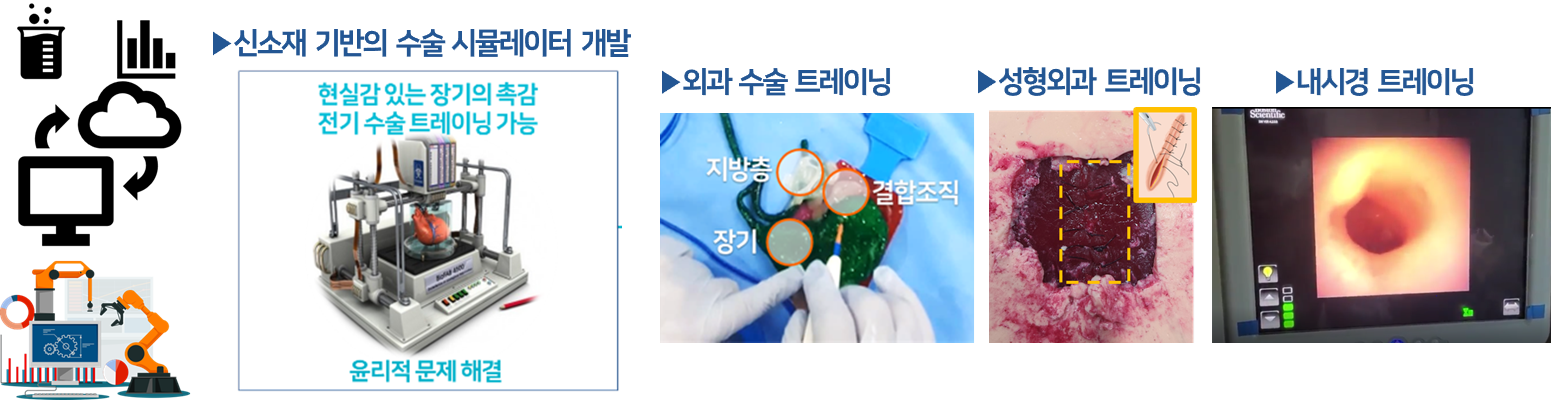 - 신소재 기반의 수술 시뮬레이터 개발로 돼지와 카데바를 대체하여 윤리적 문제를 해결할 수 있으며 다양한 수술 술기 트레이닝에 적용이 가능