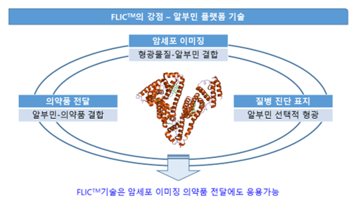FLICTM기술은 알부민에 선택적으로 공유결합하며 높은 형광수율로 형광을 만들어낼 수 있는 기술로서 요알부민 및 혈액알부민을 저비용으로 비교적 정밀하게 측정할 수 있으며, 알부민과의 결합체를 이용하여 암조직을 형광이미징하고 진단 및 치료에도 활용할 수 있는 플랫폼 기술입니다.