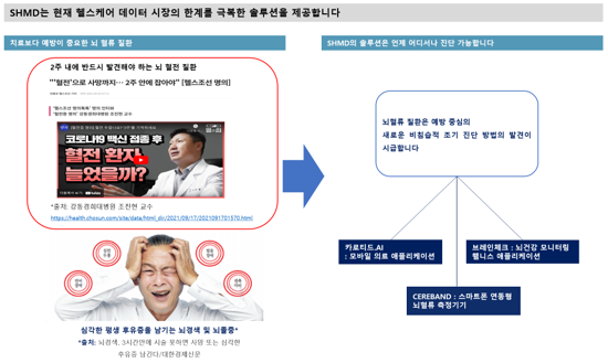 기존에는 사전적인 예방이 근본적으로 어려웠던 뇌졸중 위험을 SHMD의 혁신적인 인공지능 기술과 웨어러블 디바이스를 통해 실시간으로 모니터링하고 예측할 수 있게 하는 획기적인 의료 솔루션을 보유하고 있습니다.