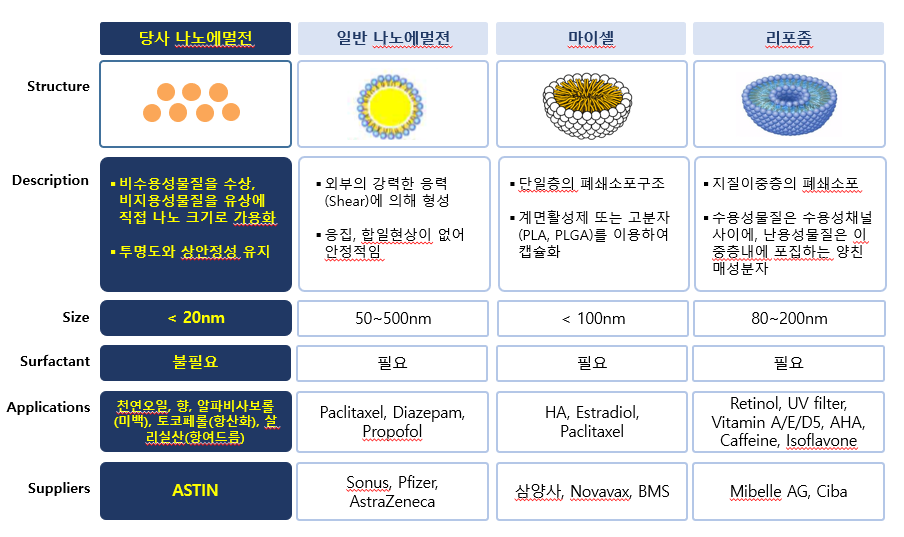 - 계면활성제가 없이도 피부 투과가 잘되는 Nano Drop Technology(NDT)이 세계 최초 상업화 성공하였고, 기술개발 완료(특허출원중)
