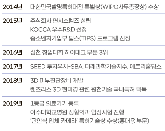 연시스템즈는 광학식 현미경을 3D 현미경으로 업그레이드해줄 수 있는 간편한 단안식 입체영상 카메라 기술을 보유하고 있습니다. 실시간 3D 비디오로 피부 속 모세혈관까지 들여다볼 수 있는 피부 현미경, 광학식 현미경에 장착해서 3D비디오로 실시간 시료 관찰을 가능하게 하는 3D 카메라 등 인체부터 미생물까지 실시간 3D 영상을 간편하게 촬영할 수 있도록 도와줍니다.