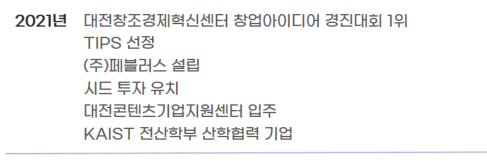 (주)페블러스는 한국전자통신연구원(ETRI)에서 컴퓨터 그래픽스, 인공지능, 로보틱스, 의료영상 분야 연구를 수행한 20년 경력의 연구자 두 명이 공동창업자로 설립한 인공지능 데이터 기업입니다. 법인 설립 전 2021년 9월 창업아이디어 경진대회에서 가상데이터 활용에 관한 내용으로 1위를 수상했고, 2021년 11월 TIPS 선정과 함께 법인을 설립했습니다.