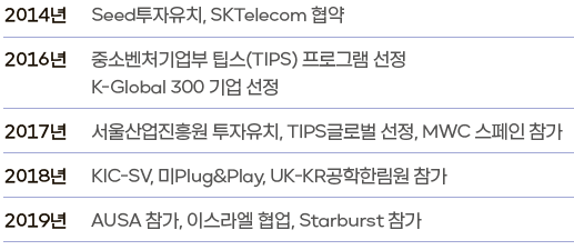 - 2020년 : 미국 및 유럽시장 진출, 해외 업체와 업무협약 체결 및 수출, 국내외 특허 출원