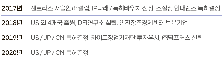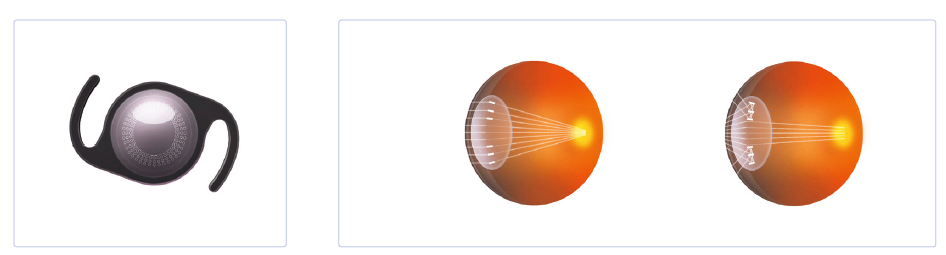 - 인공수정체 내부에 광섬유를 배치하여 빛을 정렬하고, 시력 및 시야 확보에 유효한 빛만 통과시킴으로써 초점 심도를 향상시켜 원거리, 중거리 및 근거리 시력까지 모두 확보