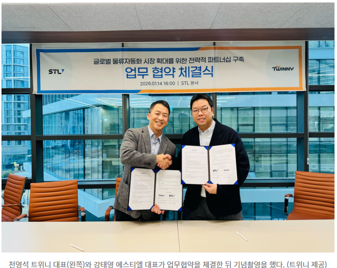 천영석 트위니 대표는 “에스티엘과 협력은 트위니의 자율주행 로봇 기술 신뢰도를 높이고 제품 확산에 중요한 전환점이 될 것”이라며 “현장 데이터와 로봇 기술이 결합한 실질적인 물류 자동화 성과를 만들어가겠다”고 말했다.
