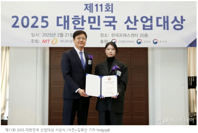 델토이드의 조예빈 개발자(사진 오른쪽)가 21일 오후 서울 중구 한국프레스센터에서 열린 머니투데이 주최의 '2025 제11회 대한민국 산업대상' 시상식에서 'AI 디지털 헬스케어' 부문 'K-스타트업대상'을 받고 송기용 머니투데이 전무와 기념사진을 촬영 중이다.