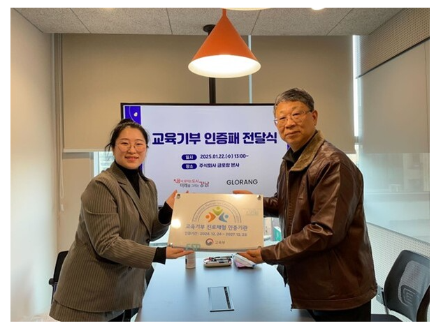 AI 에듀테크 기업 글로랑이 지난 12월 24일 교육부와 대한상공회의소가 주관하는 ‘교육기부 진로체험기관 인증제’에서 인증기관으로 선정됐다고 밝혔다.
