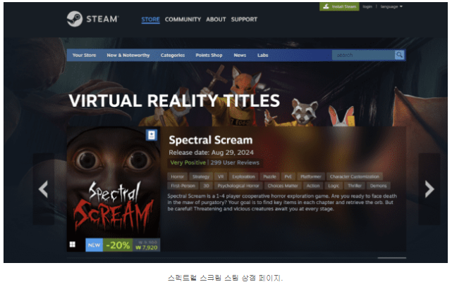 PC와 VR 크로스플랫폼 게임 스펙트럴 스크림은 현실과 지옥의 중간 지점인 연옥에 끌려와 서로가 누군지 모르는 채 동물가면을 쓰고 연옥에서 탈출할 수 있는 열쇠와 오브를 찾는 여정 속에서 이를 방해하는 크리처들을 여러 명의 이용자가 합심하여 제령해야 하는 4인 멀티 호러 파티 게임이다.