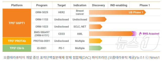ORM-6151은 'CD33 항체 기반 GSPT1 분해제'로 TPD² 기술이 적용됐다. 백혈병과 관련이 있는 GSPT1 단백질을 선택적으로 분해시키는 분해제를 항체에 붙인 DAC 신약 후보물질이다.