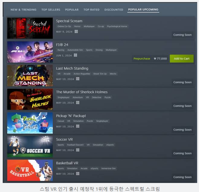 스토익엔터테인먼트가 개발하고 오는 10일 얼리 액세스에 돌입할 예정인 신작 PC와 VR 게임 ‘스펙트럴 스크림(Spectral Scream)’이 스팀 VR 분야에서 인기 출시 예정 제품 1위에 올랐다.