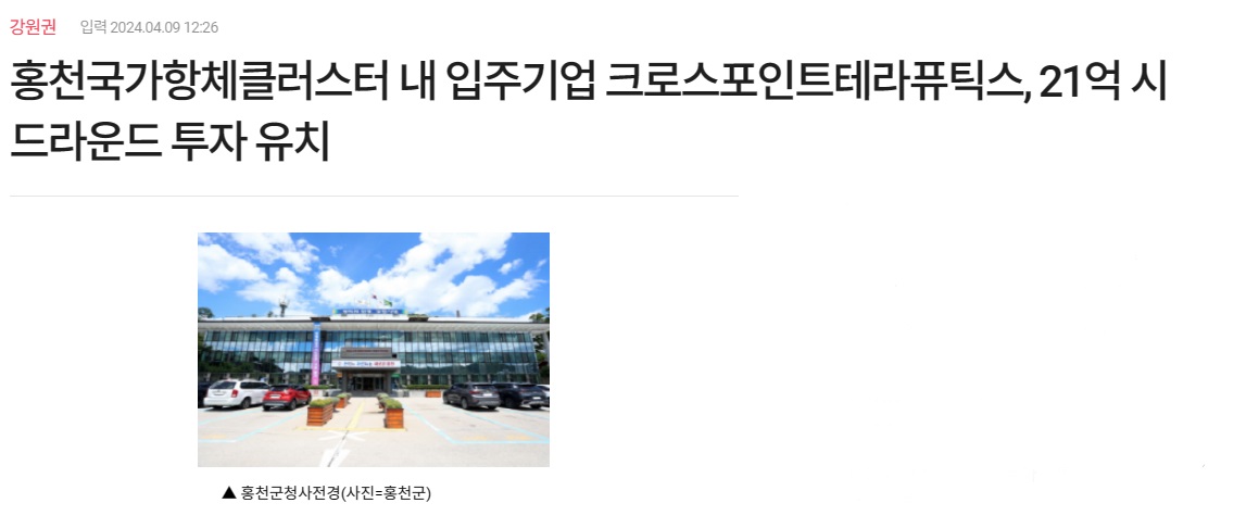 [대한매일신보] 홍천국가항체클러스터에 입주한 크로스포인트테라퓨틱스가 21억 규모의 시드라운드 투자를 유치했다는 소식이 전해졌다.크로스포인트테라퓨틱스는 스텔스바디를 기반으로 차세대 면역항암제를 개발하는 기업이며 IM-ADC와 같은 혁신적인 제품 등을 개발하고 있다.ADC 자체 항체 플랫폼 스텔스바디는 항체의 면역기능을 없애고 항체 치료제의 효능과 혈중 지속성을 높이면서 독성과 부작용을 크게 줄일 수 있는 기술이다.기사_바로가기