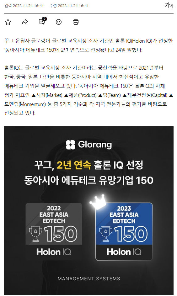 AI 에듀테크 글로랑, 2년 연속 홀론 IQ '동아시아 유망기업 150' 선정