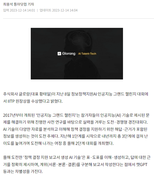 AI 탤런트테크 글로랑, 인공지능 대회서 IITP 원장상 수상