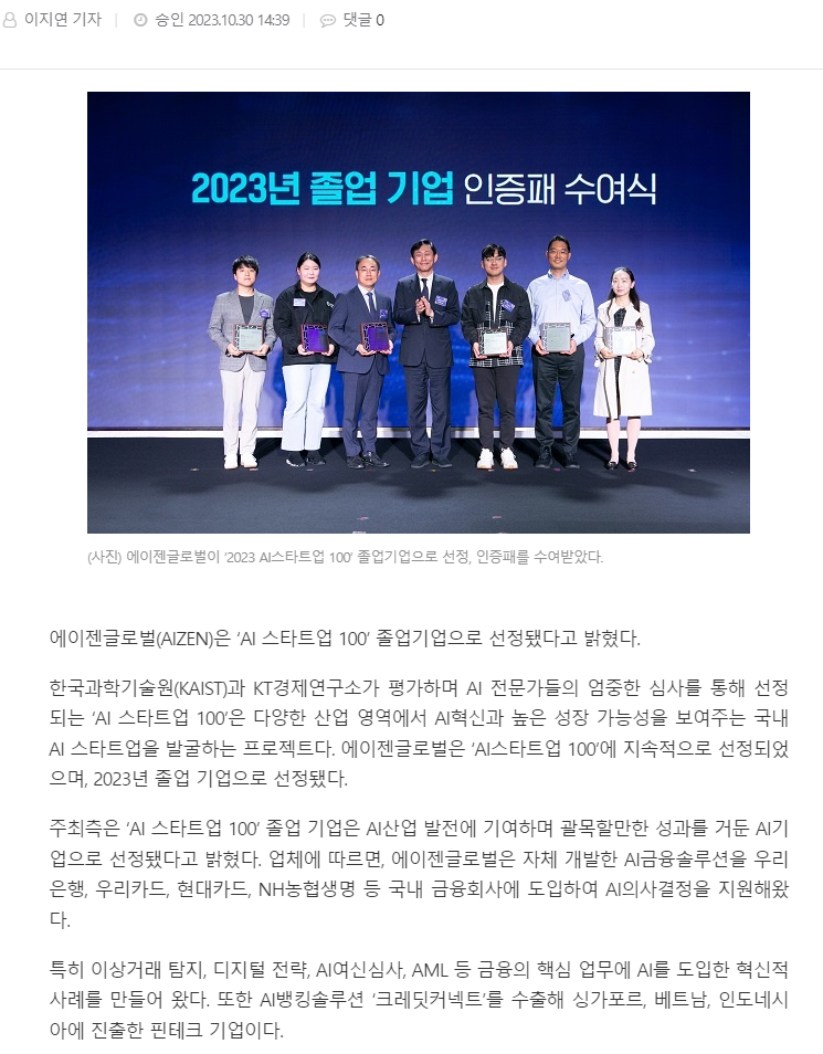 에이젠글로벌, ‘AI 스타트업 100’ 졸업기업 선정