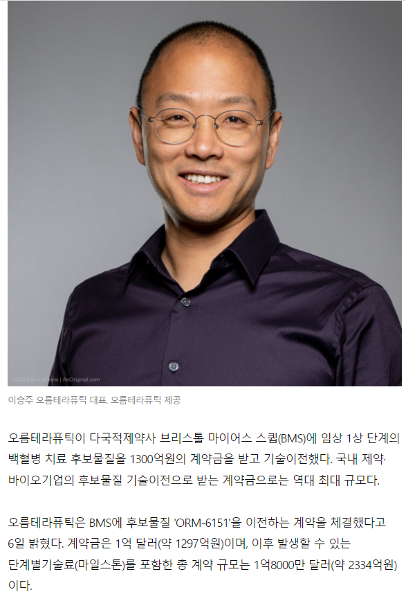 오름테라퓨틱, BMS와 계약금 1300억원 기술이전 계약