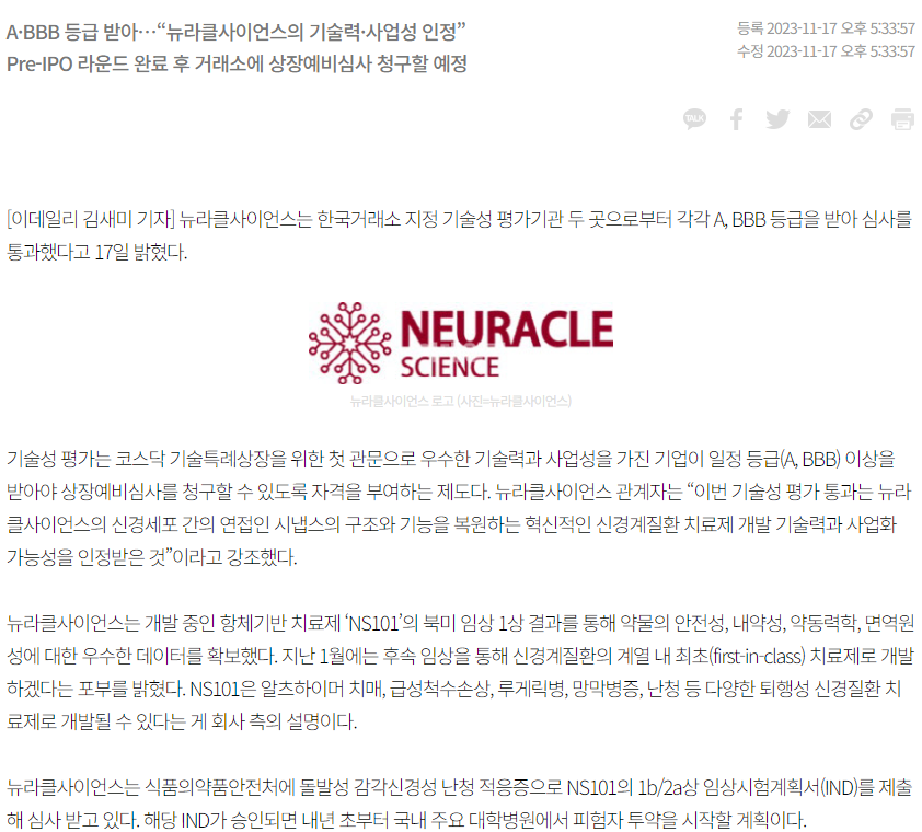 뉴라클사이언스, 기술성 평가 통과…내년 코스닥 상장 목표