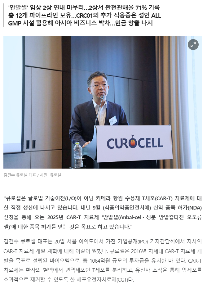 "큐로셀, 2025년 CAR-T 치료제 허가 목표… 연 700명 치료제 생산"