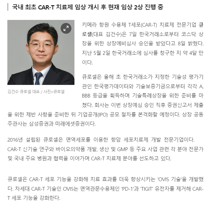 'CAR-T 치료제' 큐로셀, 코스닥 상장예비심사 통과
