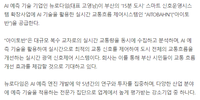AI 예측 뉴로다임, 부산에 '실시간 교통흐름 제어 시스템' 공급