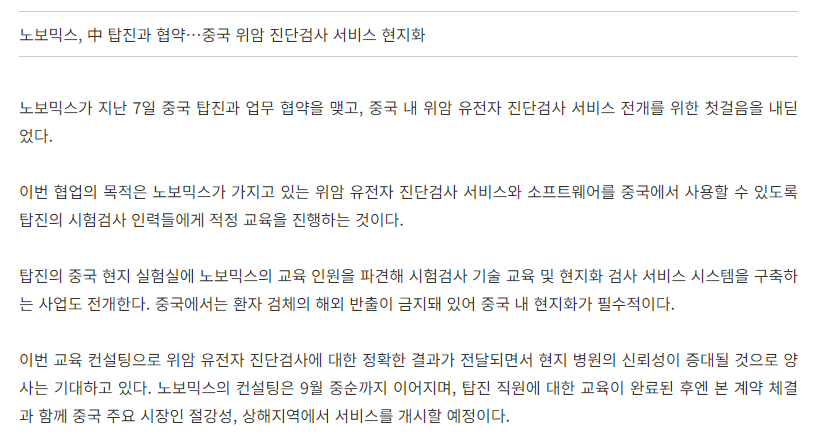 노보믹스, 中 탑진과 협약…중국 위암 진단검사 서비스 현지화