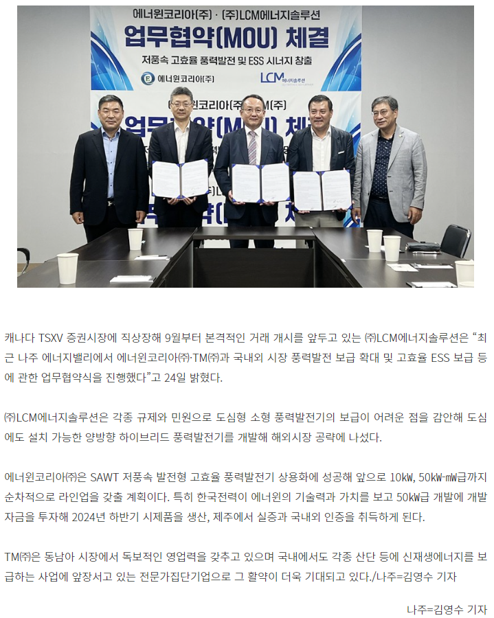 LCM에너지솔루션-에너윈코리아-TM ‘풍력발전’ 협약