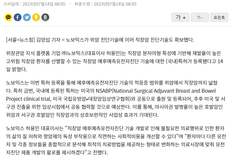 노보믹스, 직장암 예후예측유전자진단 기술 특허 등록