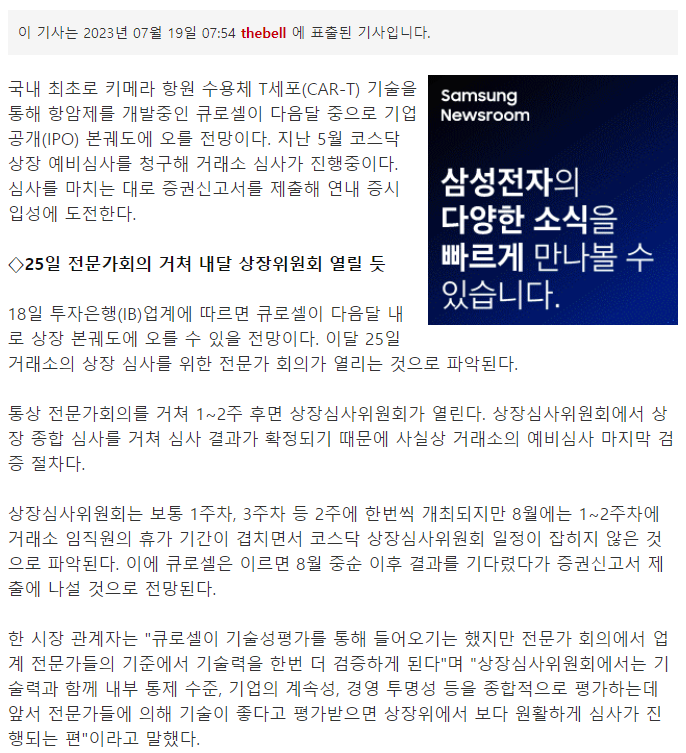 기술성 평가 재도전 큐로셀, 전화위복되나