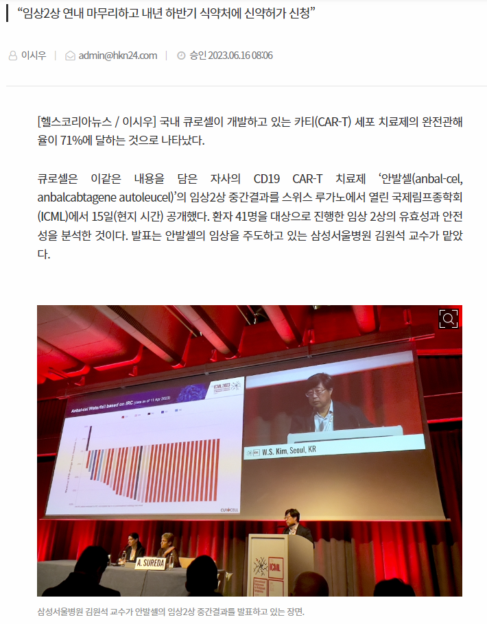 큐로셀 “CAR-T 치료제 안발셀 완전관해율 71%”