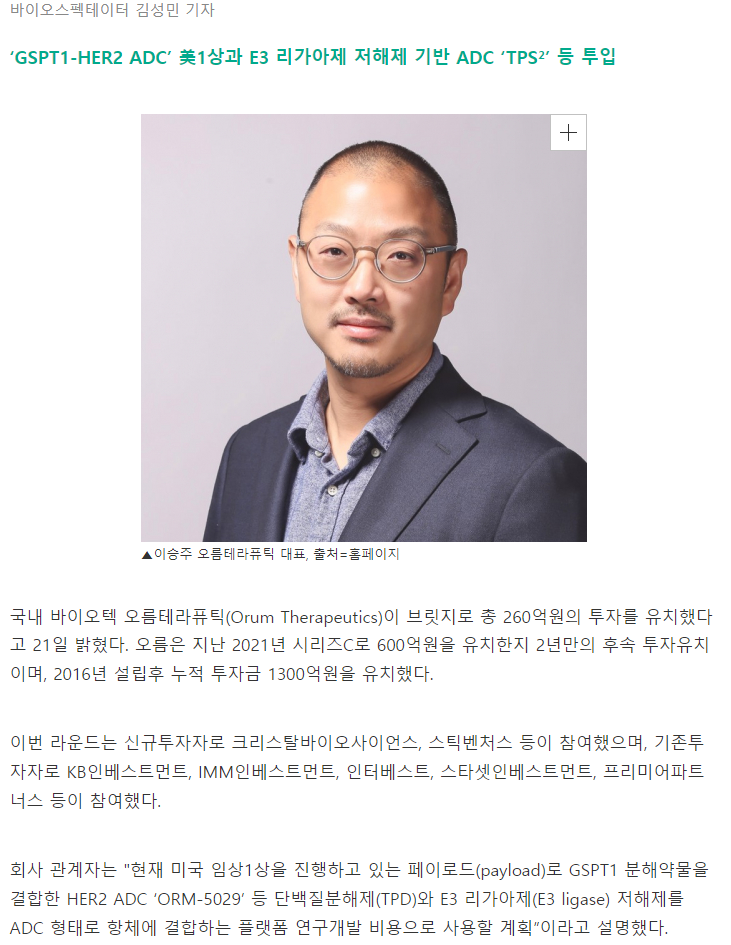 오름테라퓨틱, 260억원 브릿지 유치..“ADC 임상투입”