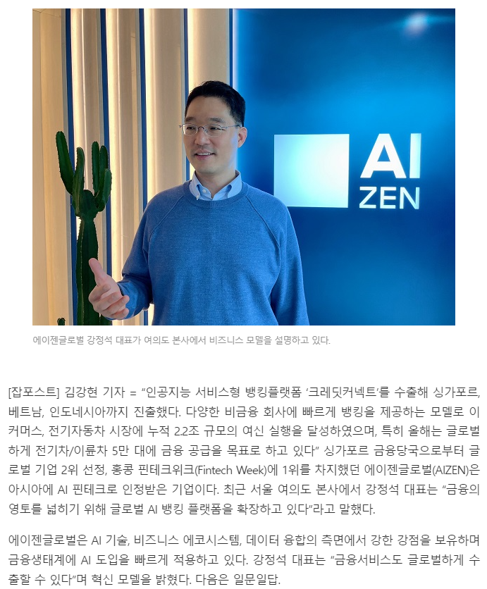 에이젠글로벌 강정석 대표, “에이젠글로벌 AI금융으로 글로벌 핀테크 도약”