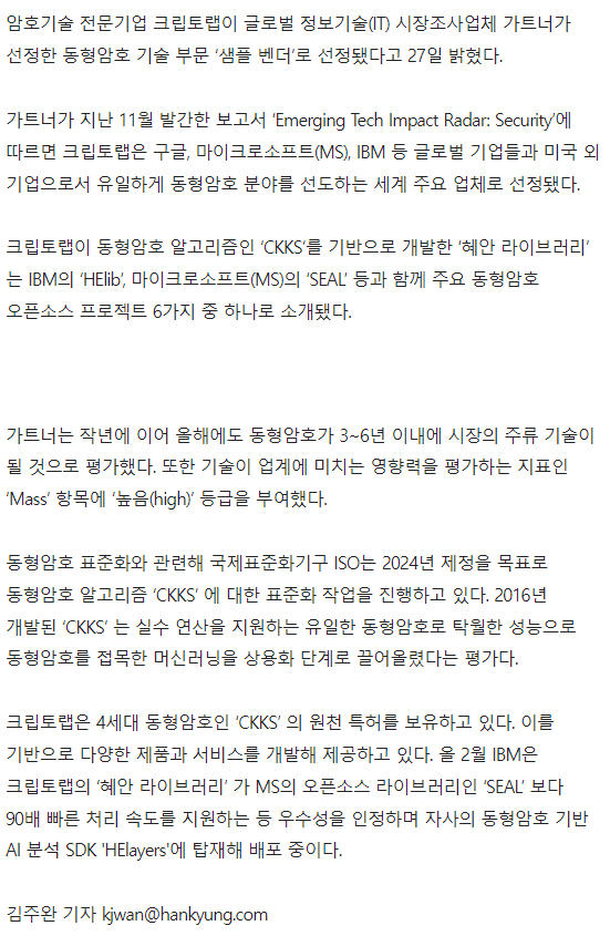 크립토랩, 구글, MS와 최고 동형암호 기술업체로 선정