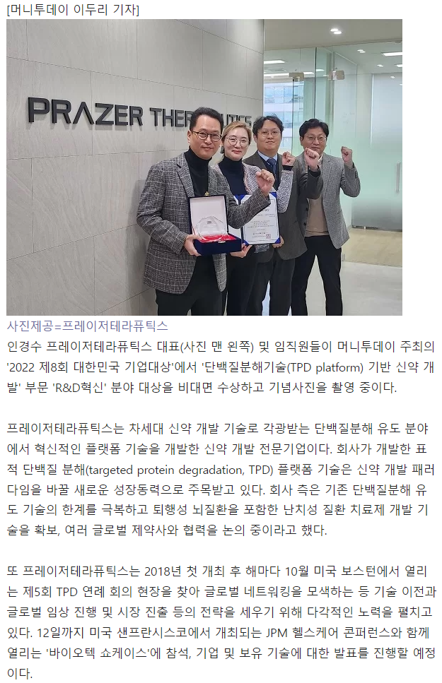 '신약 개발' 프레이저테라퓨틱스, R&D혁신 분야 '기업대상'