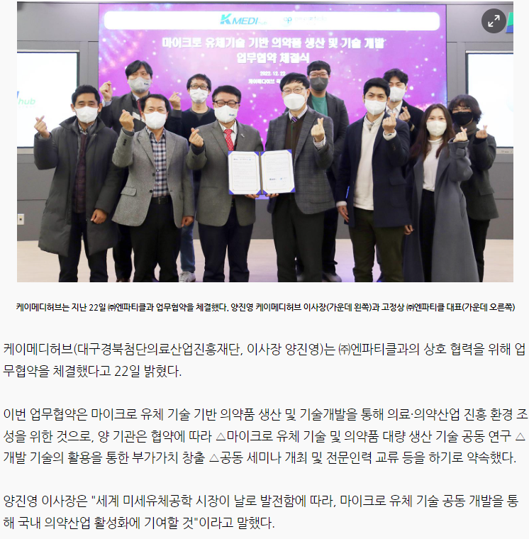 케이메디허브, ㈜엔파티클과 혁신의약품 대량 생산 기술 개발 협약