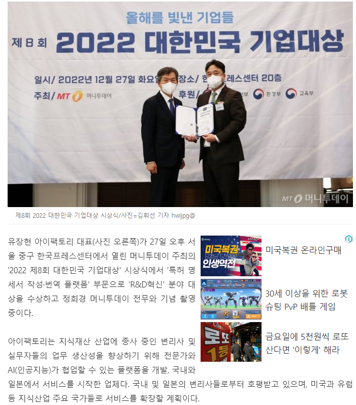 '특허 명세서 작성·번역 플랫폼' 아이팩토리, R&D혁신 '기업대상'
