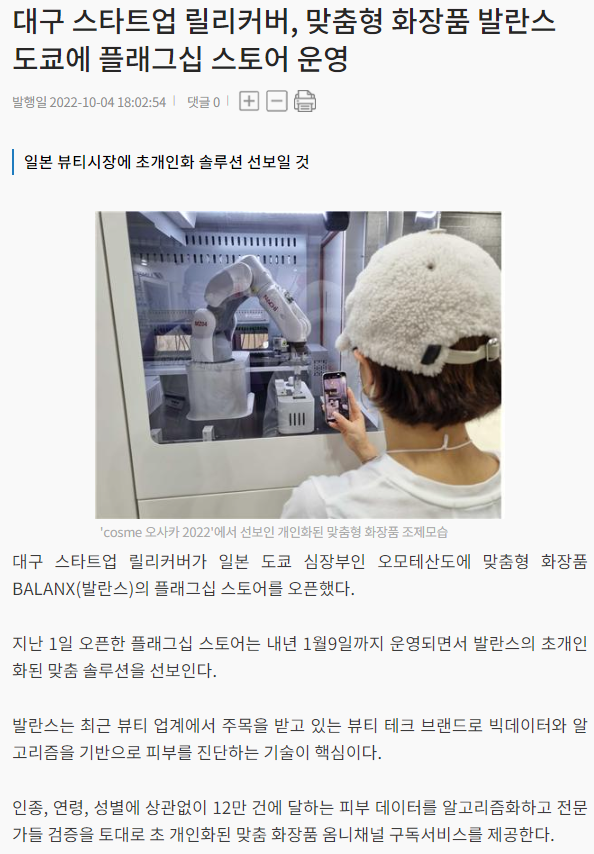 대구 스타트업 릴리커버, 맞춤형 화장품 발란스 도쿄에 플래그십 스토어 운영