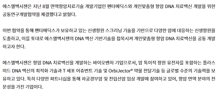 에스엘백시젠, 펜타메딕스와 ‘개인 맞춤형 항암백신’ 공동연구