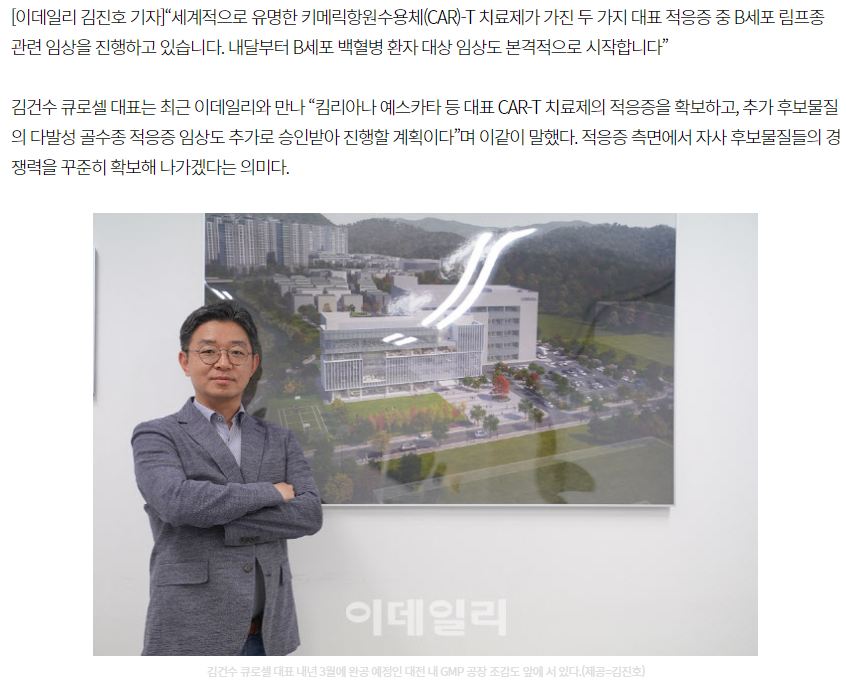 김건수 큐로셀 대표 “림프종 이어 내달 CAR-T 백혈병 임상 본격화” - 팜이데일리