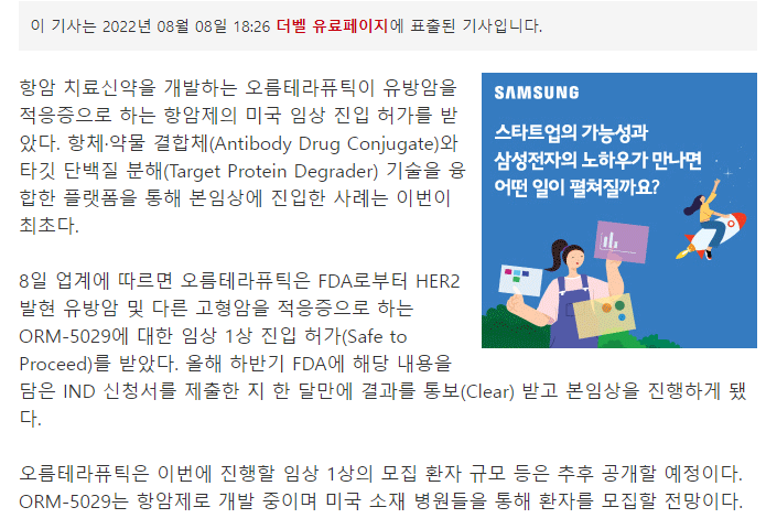 오름테라퓨틱, 'ADC+TPD' 항암제 임상 1상 진입