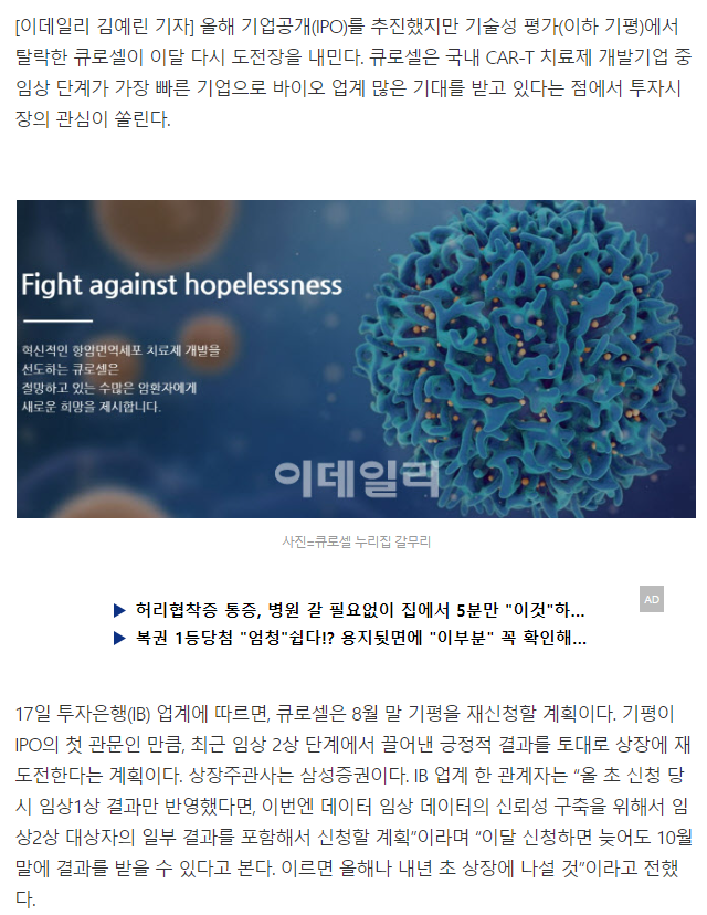 [마켓인]CAR-T 개발 큐로셀, 상장 위한 기술평가 재도전