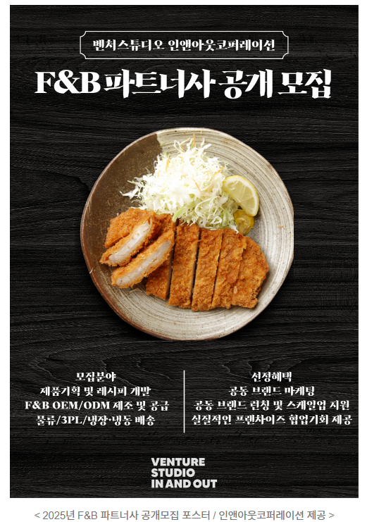 벤처스튜디오 인앤아웃코퍼레이션이 식음료(F&B) 분야 브랜드들과의 협력을 통해 상호 성장을 도모할 파트너사를 공개 모집한다고 밝혔다. 이번 모집은 인앤아웃코퍼레이션이 브랜드 성장을 의뢰한 다양한 F&B 브랜드 및 창업자들을 지원하고, 이들의 스케일업을 가속화하기 위한 전략적 목적을 갖는다.