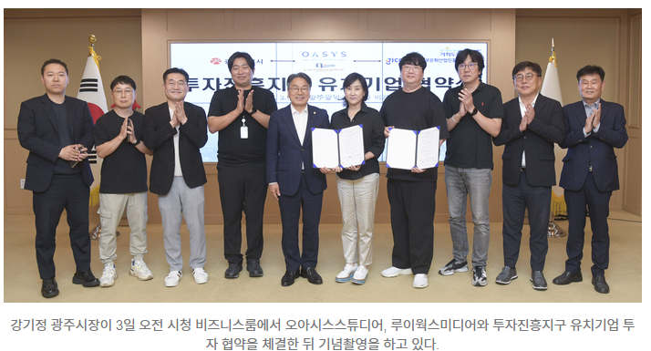 이번 투자협약을 계기로 △광주시: 기업 이전 관련 행정·재정적 지원 △광주정보문화산업진흥원: 인프라(시설·장비) 활용 및 지역 인재 채용 지원 △오아시스 스튜디오: 자회사 설립 및 고용 창출 △루이웍스 미디어: 본사 이전 및 고용 창출 등 전략적 협업을 추진한다.
