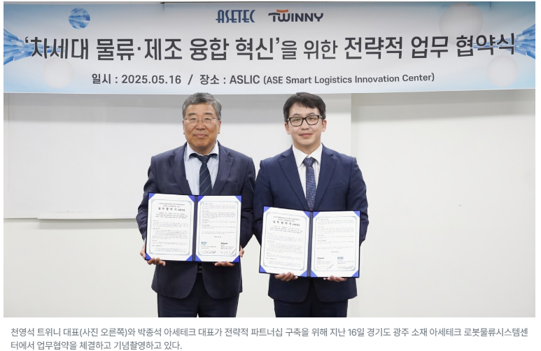트위니(대표 천홍석·천영석)가 아세테크(대표 박종석)와 지난 16일 경기도 광주 소재 아세테크 로봇물류시스템센터에서 전략적 파트너십 구축을 위한 업무협약을 체결했다고 19일 밝혔다.