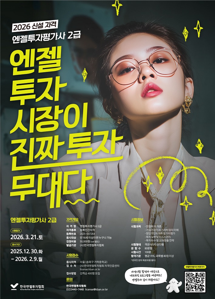 전문성을 갖춘 엔젤투자 인력을 양성하기 위하여 민간자격 「엔젤투자평가사 2급」을 2026년 신설·운영하고 있습니다.
