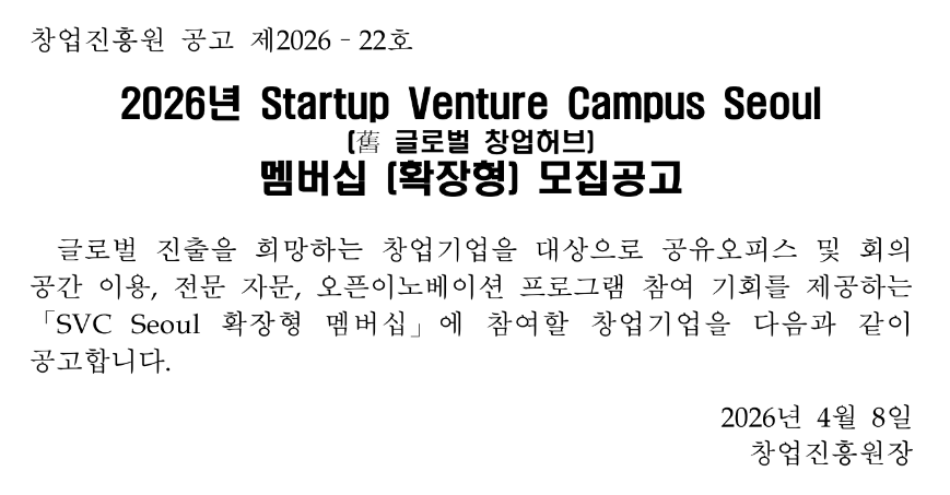 공유 오피스, 자문 바우처, 오픈이노베이션 프로그램 참여 기회를 제공하는 「SVC Seoul 멤버십(확장형)」 참여기업을 모집합니다!