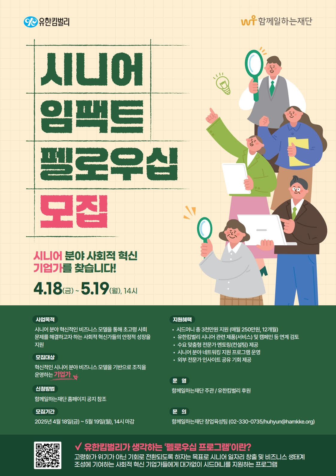 1. (사업목적) 시니어 분야 혁신적인 비즈니스 모델을 통해 초고령 사회문제를 해결하고자 하는 사회 혁신가들의 안정적 성장을 지원하기 위해 유한킴벌리와 함께일하는재단이 시니어 임팩트 펠로우십 프로그램을 기획 및 공동 운영