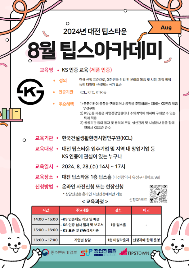 8월 팁스아카데미 KS 인증 교육(제품인증) 안내
