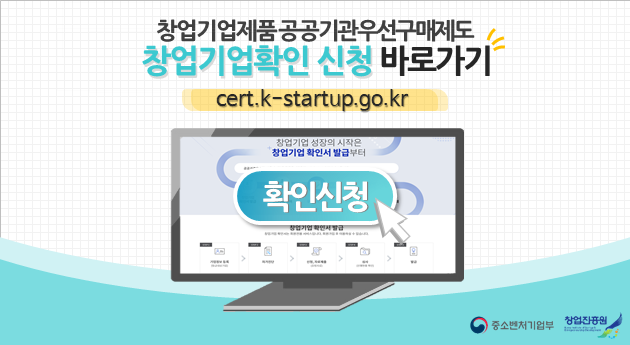 • 2021년부터 '창업기업제품 공공기관 우선구매제도'가 시행됨에 따라, 현재 창업진흥원에서 창업기업 확인서를 발급하고 있습니다.